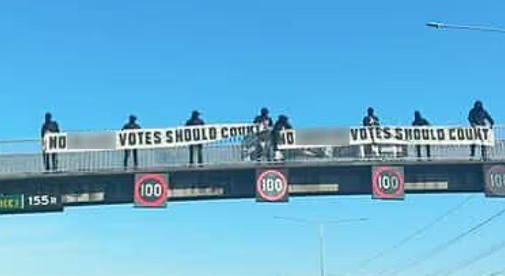 وأفاد شهود عيان أن مجموعات مكوّنة من حوالي 30 شخصًا، يرتدون ملابس سوداء بالكامل ويغطون وجوههم، انتشروا على عدة جسور ورفعوا لافتات كُتب عليها: “لا تُحتسب أصوات السود”، و”لا تُحتسب أصوات المسلمين”، و”تُحتسب فقط أصوات الأستراليين”.
