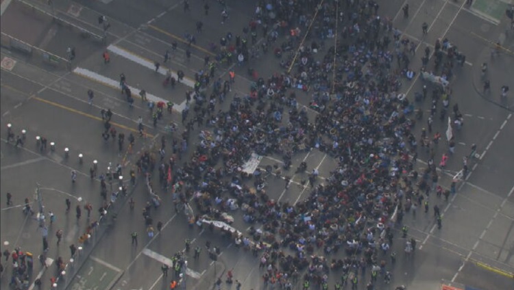 اندلعت مواجهة متوترة بين المجموعة والشرطة خارج محطة شارع فليندرز بعد أن جلس المتظاهرون في منتصف تقاطع شارعي Flinders وSwanston المزدحم حوالي الساعة الثالثة مساءً.
