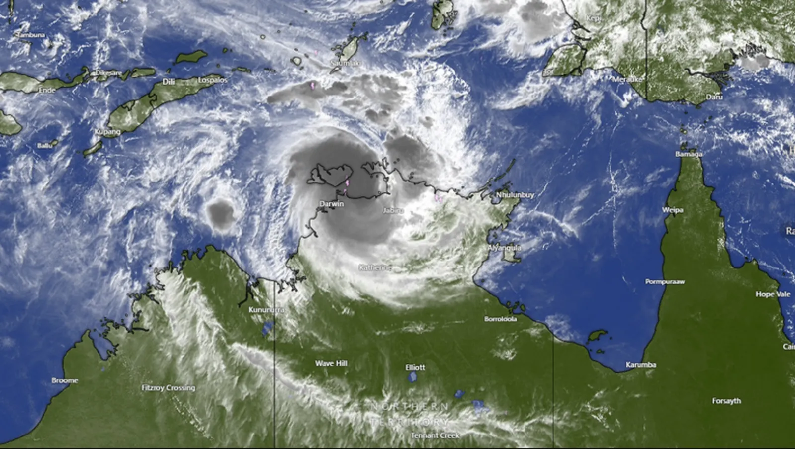وفي وقت مبكر من صباح السبت، تم إعلان عن المناطق التي شملها التحذير من الإعصار، وتشمل Darwin، وشبه جزيرة Cobourg، وجزر Tiwi، ومنفذ نهر Daly وصولا إلى Warruwi، بالإضافة إلى المناطق الداخلية حتى Batchelor.
